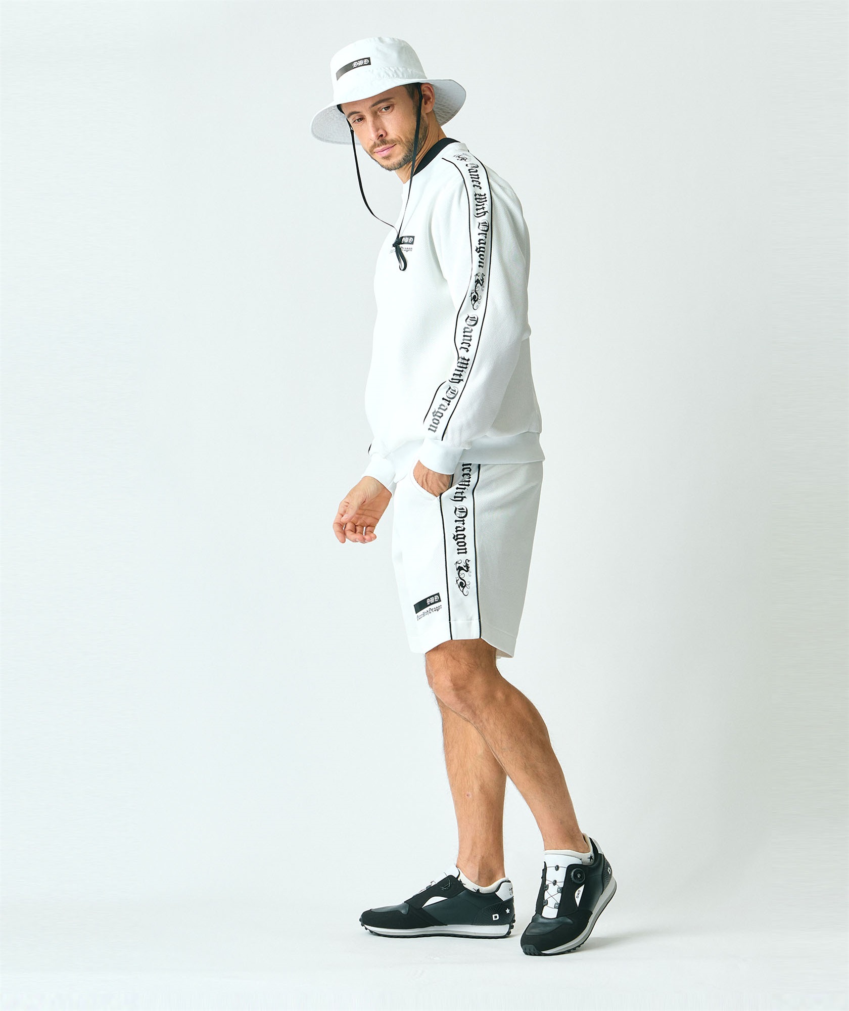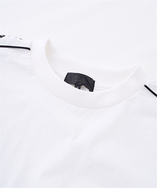 サイドに配された大胆なラインデザインが、視覚的にシャープなシルエットを形成。首元や袖口の設計にもこだわり、防風性と動きやすさを両立させました。一枚での着用はもちろん、インナーにハイネックを合わせたレイヤードスタイルも美しく決まる、現代的なゴルフスタイルを象徴する一着です。