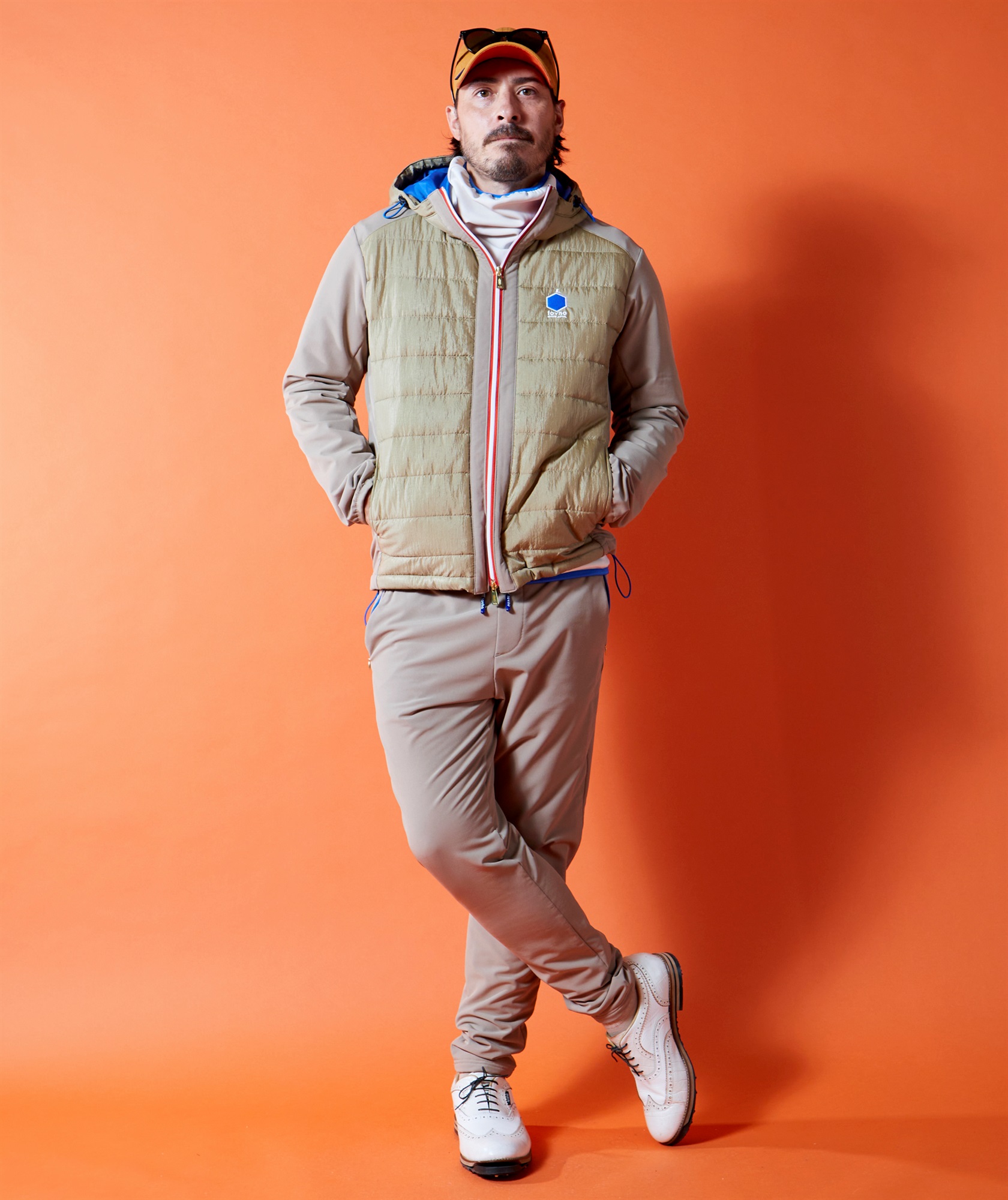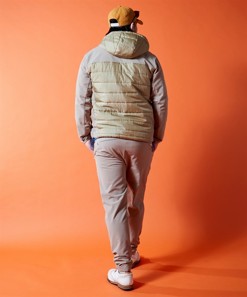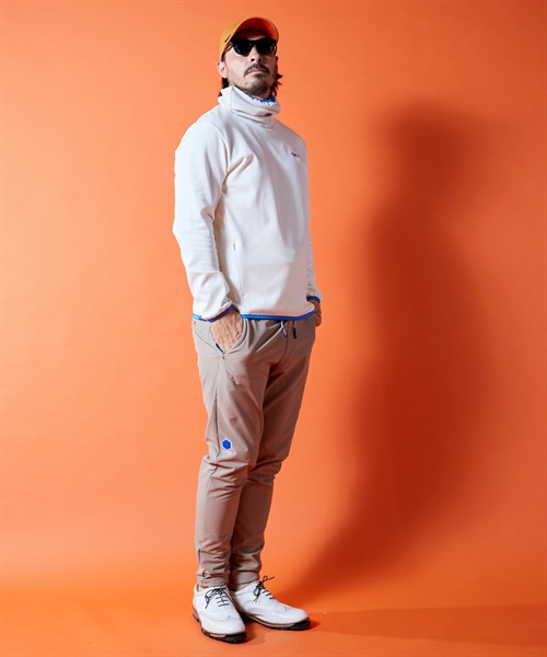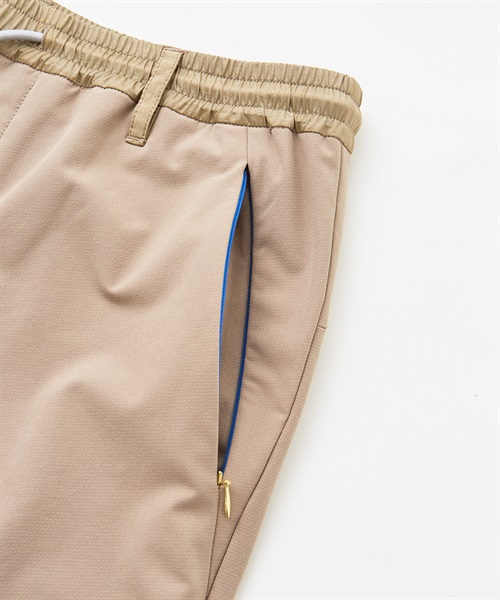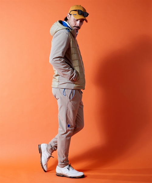 21-381105のセットアップパンツ。撥水性、UVカット、保温性、4方向への優れたストレッチ性を持ち合わせた二重多機能素材、BACKフリースニット。撥水加工はフッ素フリーで環境にも配慮。前後身頃の中綿の表地には繊維廃棄物から再生されたナイロンを使用。ナイロン独特の肌さわりの良い風合い、そして光沢感を持たせながらヴィンテージワッシャーによる表情変化でハイブリッドな仕上がりに。前シーズンリピートアイテムです。