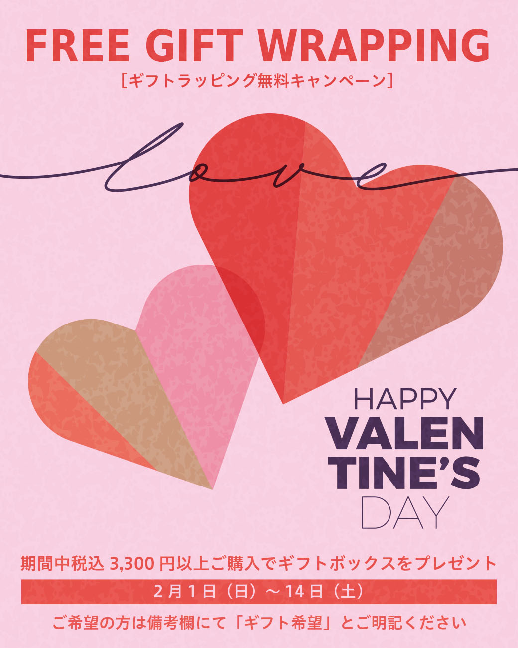 2月2日(月)~14日(土)の期間中、税込3,300円以上ご購入で、ギフトボックス、ギフト袋をプレゼントいたします。
